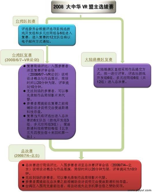 竞技术、飙创意!3D/VR 的年度盛事『2008 大中华区 VR 盟主选拔赛』已经正式拓展为两岸四地 Virtools 数字创作的超级赛事。从 2003年台湾地区首届赛事开始,VR 盟主选拔赛的参赛地区和人数不断扩增,引起了兴趣爱好者和业界的广泛关注,历经了四届 3D/VR 创意推广,如今它已经成为爱好梦想实践的朋友挥洒热情的舞台。2007 年,在 Virtools 原厂的大力支持下,『 VR 盟主选拔赛』首度跨足两岸三地,为华人的数字内容创作竞赛增添了国际化格局与色彩,各路高手云集在此,务求一战成名。『 VR 盟主选拔赛』突出创意竞技交流,深化了 Virtools 技术人才培育,为华人世界 3D/VR 数字设计注入强大的生命力!