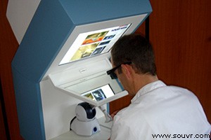 图1. VOXEL-MAN TempoSurg图示。使用镜子下方的力反馈装置,可以让钻针在手术区域内自由移动。