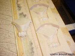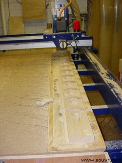 照片中展示的是New Wave公司在雕刻机上对手工雕刻床腿进行加工。首先用FastSCAN对手工雕刻好的床腿进行扫描,扫描数据转换为STL格式文件保存,然后存入CAD程序中的X轴,并复制出12个相同的床腿。文件导入到CAM软件,并存入雕刻机。雕刻机会首先雕出床腿的上半部分,一般需要2小时可以完成。之后,把固定板翻转,对床腿的底部进行打磨。完成后,把床腿锯出来。用1/2英寸销钉对把床腿固定。这时,工作人员对床腿进行清理,并弥补上雕刻机无法完成的细节部分。手工雕刻床腿需要4小时,扫描床腿、编写程序、机械雕刻12个床腿只需要8小时。New Wave公司3D/CAD/CAM部门负责人盖伊•马修斯评价说:“FastSCAN扫描仪至少为我们节省了40个小时的手工雕刻时间。”