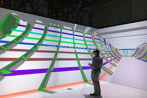 美国威奇塔州立大学早在2014年就开始与两家企业合作深入合作开发虚拟现实系统。学校的目标是优化产品概念和设计工艺,测试用户体验,完善虚拟样机,设施规划和认证,缩短各行业产品开发时间。为了实现这些目标,美国Mechdyne集团设计了巨型FLEX系统,投影屏幕宽19英尺,高10英尺,两侧投影屏幕长10英尺。12个LED投影机在投影屏幕和地幕的分辨率是4K高清显示,使用8个光学追踪相机进行追踪。