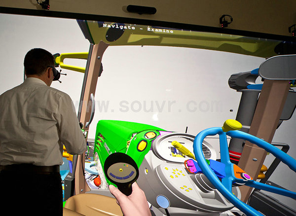 在面积5m x 2.6m立体投影墙上显示各种农机设备的CAD模型。系统主要设备是两台DLP投影机,ART追踪系统和大型背投投影屏。用户使用头部追踪眼镜观看模型,其他室内人员(最多20人)也可以使用追踪眼镜观看三维高清模型。