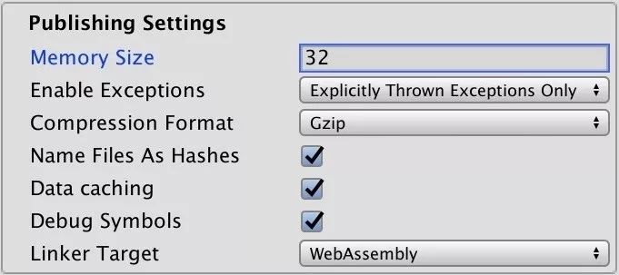 我们坚信WebAssembly的未来,也鼓励开发人员默认使用它来进行开发。如有需要,可以将asm.js保留为旧版浏览器的运行时回退。该功能可以通过在WebGL Player Settings中选取WebGLLinkerTarget.Both实现。