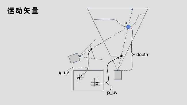 例如,当摄像机的位置从 q 变为 p 时(如图所示),屏幕上的某个点很可能会被投射到另一个点上。将这两个点相减便能得到此次运动的矢量,即前一帧相对于当前帧的位置。