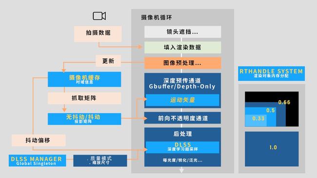 DLSS 管理器会使用 RTHandle 系统在摄像机创建之际分为渲染对象分配一次内存,省去为每次摄像机循环都分配一次内存的必要。