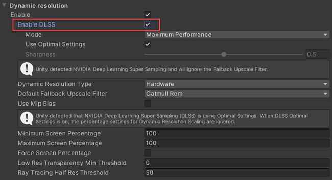 找到 Dynamic resolution(动态分辨率)组(DLSS 是通过 HDRP 的 Dynamic resolution 功能来提供的)