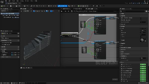 此外,还有一个面向几何体的全新可视化脚本工作流程,它提供了超过125个新的蓝图节点,允许你在不编写任何C++代码的前提下创建复杂的脚本,例如,让楼梯自动调整阶梯数量,适应给定的距离。你可以在随UE5发布的免费Lyra初学者游戏包示例项目中看到楼梯的例子。