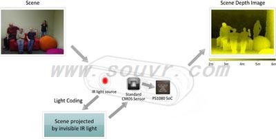 PrimeSense采用Light Coding™(光编码)技术进行深度图像捕捉。Light Coding利用近红外光对场景进行编码。红外光编码对于人眼是不可见的。然后系统将使用普通的成品CMOS 图像传感器读取场景的编码光。PrimeSense的系统芯片与CMOS图像传感器相连,可执行复杂并行算法对收到的光编码进行解码,并生成场景的深度图像。该产品不受周围环境光的影响。