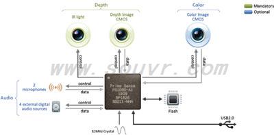 PrimeSensor重要部件是PrimeSense PS1080系统芯片。该芯片可以对红外光源进行控制,从而以红外光编码的方式投影出场景图像。红外投影器属于一级安全光源,符合IEC 60825-1标准。采用标准CMOS图像传感器负责接收放出的红外光,并将红外光编码图像传送至PS1080芯片。PS1080芯片负责处理红外图像,然后逐帧生成准确的场景深度图像。PrimeSensor包括两种可选传感器输入功能,分别为:彩色(RGB)图像和音频(PrimeSensor有两个麦克风,并配有四个外部数码音频源设备接口)。