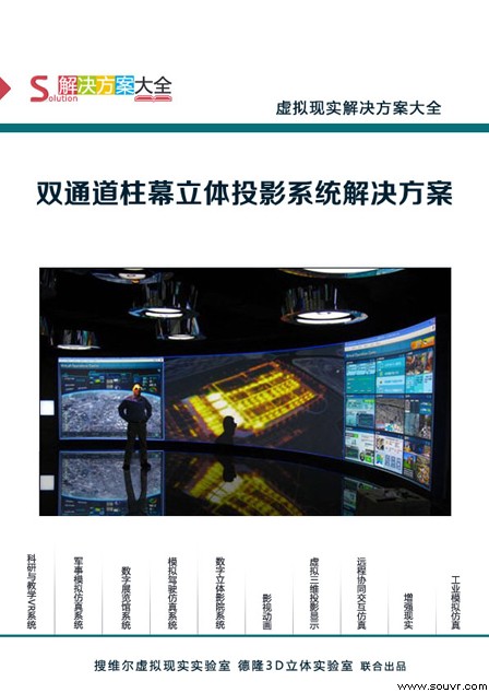 本方案由搜维尔VR实验室推出。双通道柱幕立体投影系统是虚拟三维投影显示系统中一种沉浸式虚拟仿真显示环境,系统采用环形的投影屏幕作为仿真应用的投射载体,所以通常又称为环幕投影系统。根据环形幕半径的大小,通常为120 、135、180、240、270、360度弧度不等,由于其屏幕的显示半径巨大,通常用于一些大型的虚拟仿真应用,比如:虚拟战场仿真、数字城市规划、三维地理信息系统等大型场景仿真环境,近来开始向展览展示、工业设计、教育培训、会议中心等专业领域发展。